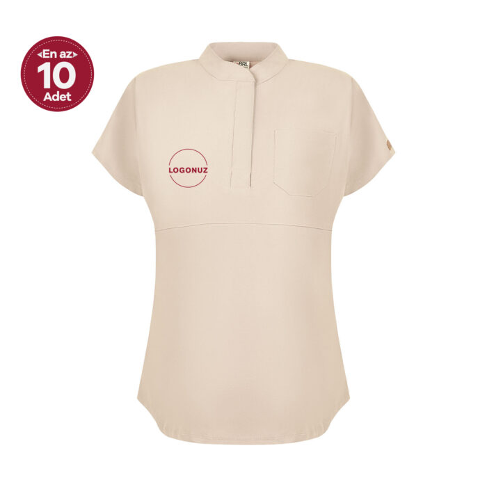 Bej Kadın Çıt Çıtlı Likralı Hakim Yaka Doktor ve Hemşire Cerrahi Forma Üst