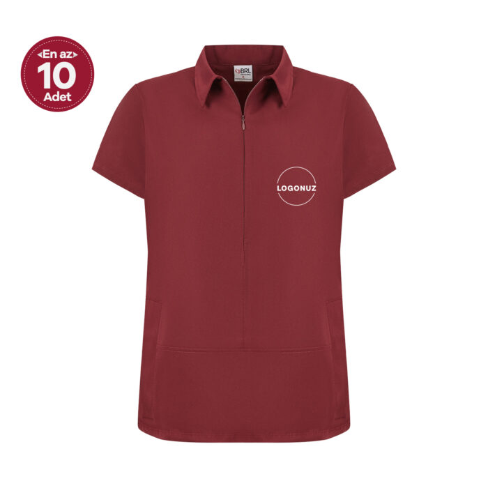 Bordo Kadın Gizli Fermuar Yan Cepli Polo Yaka Doktor ve Hemşire Cerrahi Forma Üst