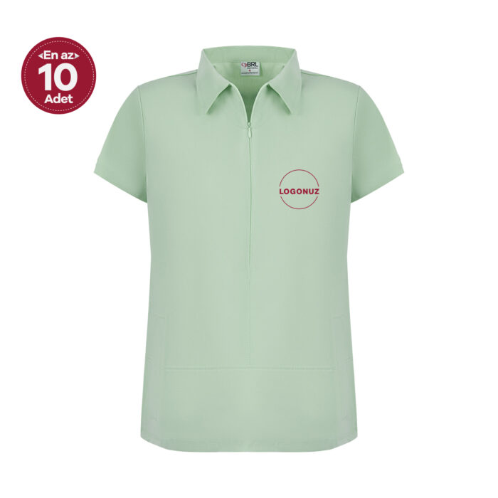 Çağla Yeşili Kadın Gizli Fermuar Yan Cepli Polo Yaka Doktor ve Hemşire Cerrahi Forma Üst